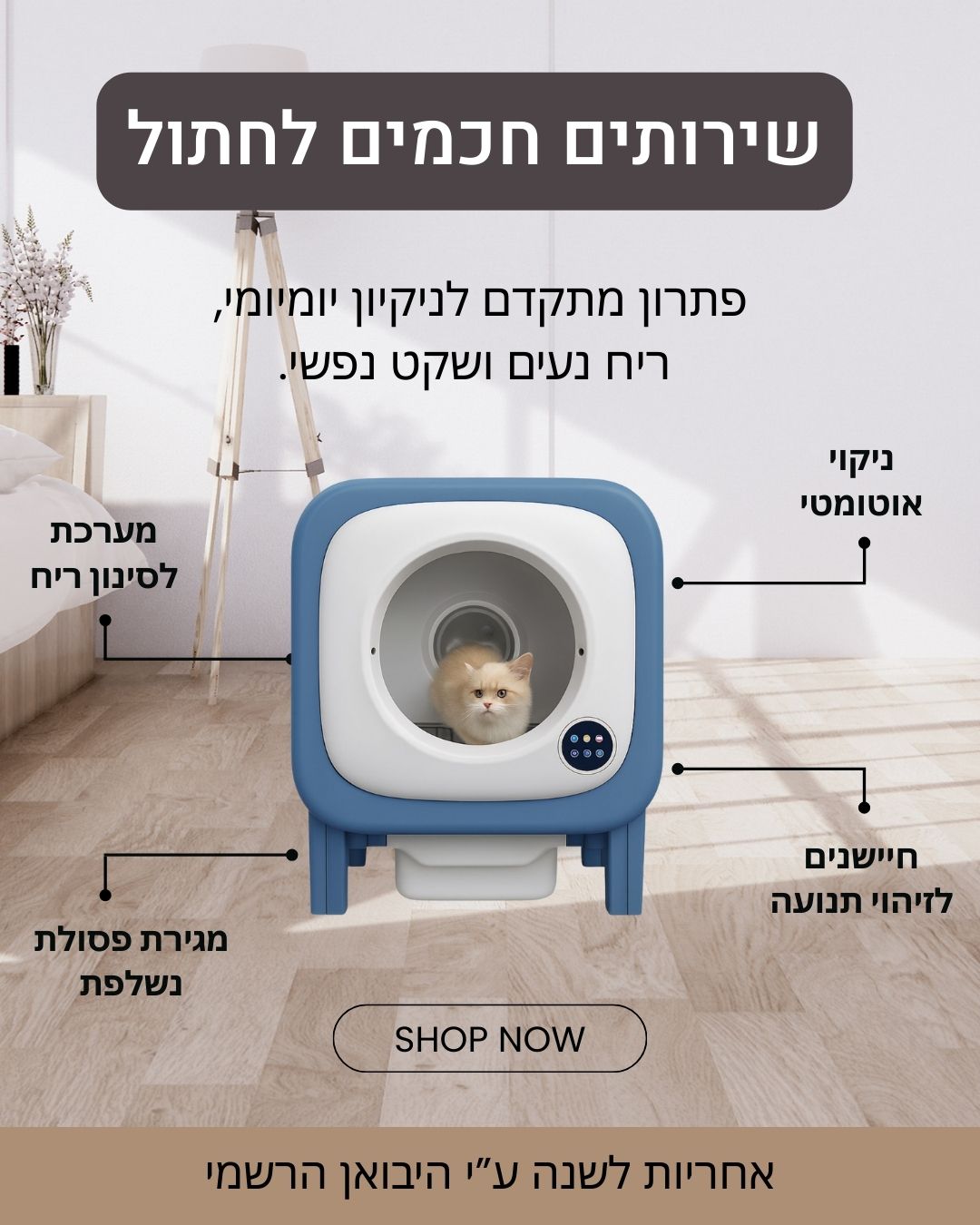 המערכת האוטומטית מזהה מתי החתול משתמש בארגז, ממתינה לסיום, ומבצעת ניקוי עצמי מלא – בלי צורך בהתערבות ידנית. עם מערכת לסינון ריחות, פעולה שקטה במיוחד ושליטה מלאה דרך אפליקציה – אתם שומרים על ניקיון, חוסכים זמן, ונהנים מאוויר נקי בבית.